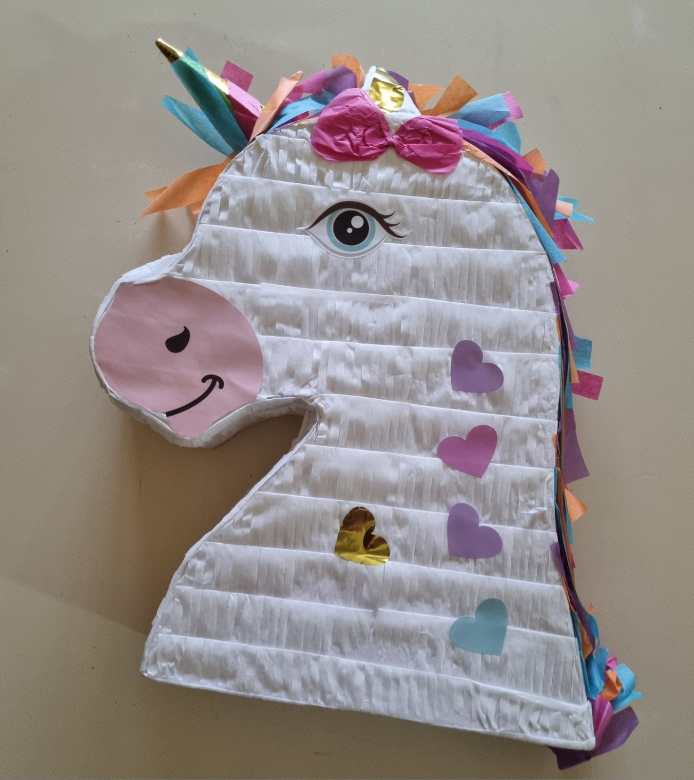Unicorn face shaped pinata-sold empty. Pinata is sold empty, without a stick. Great addition to a unicorn party. Fill with sweets, hang up and let the fun begin. Measures 35cm from head to neck and 27.5cm from the mouth to the main.