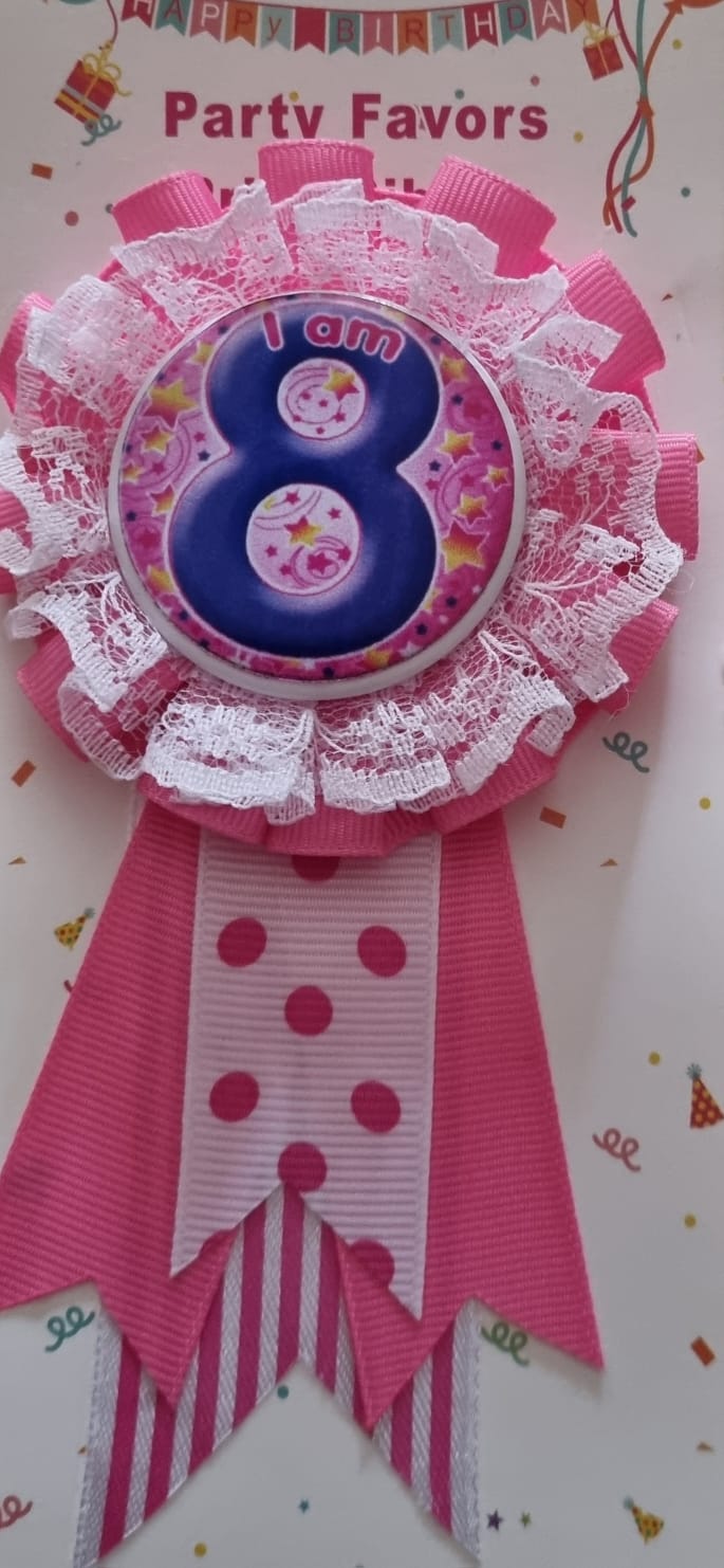 Number 8 birthday badge pink rosette. Pink badge, Stick on the birthday kid’s clothing. Great way to show it’s your 8th birthday.