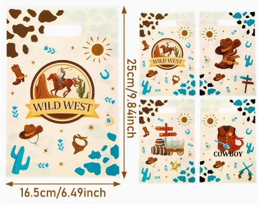 Cowboy theme loot bags. 10 Bags per pack. 4 Assorted designs in each pack. Perfect for sweets, popcorn or candy floss.