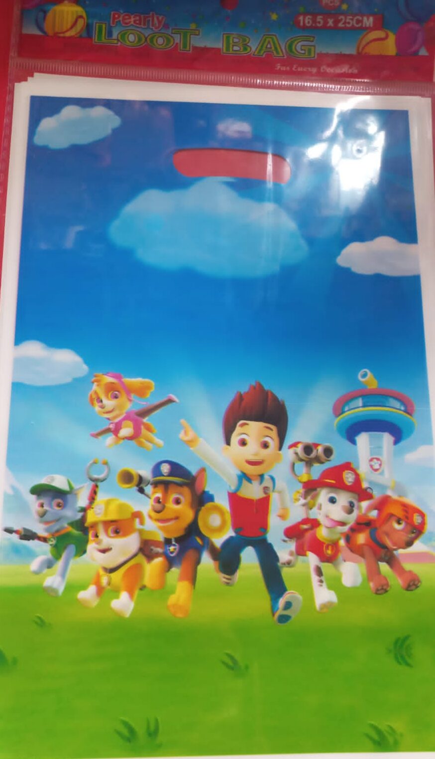 Paw patrol loot bags. 10 Bags per pack. Fill with sweets, candy floss or popcorn. Measures 24.5 cm from top to bottom and 15.5 cm from left to right.