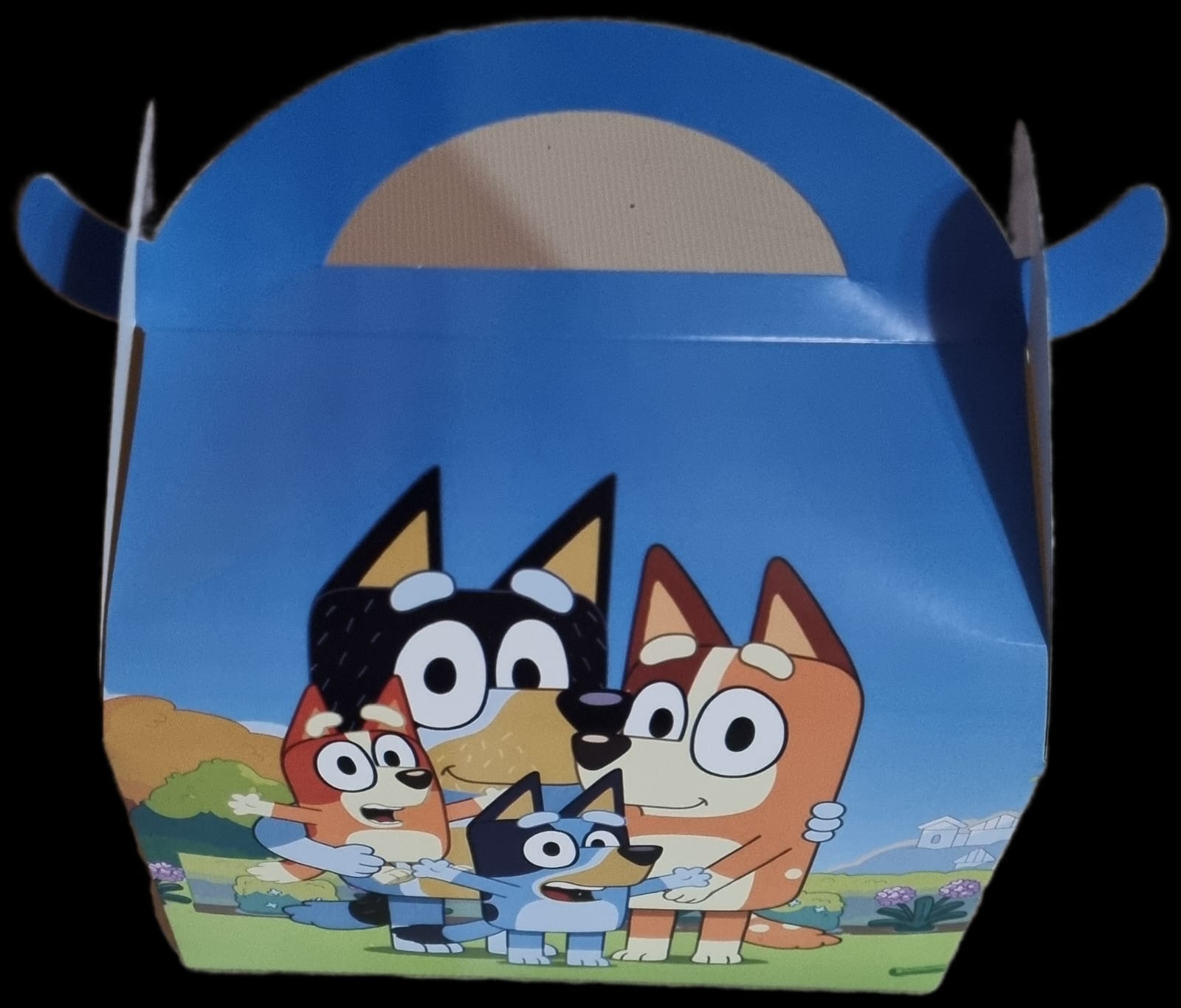 Bluey cardboard party boxes. 10 Boxes per pack. Measures 16cm x 9cm x 9cm. Great for sweets, snacks or thank you box. Such a family favourite.