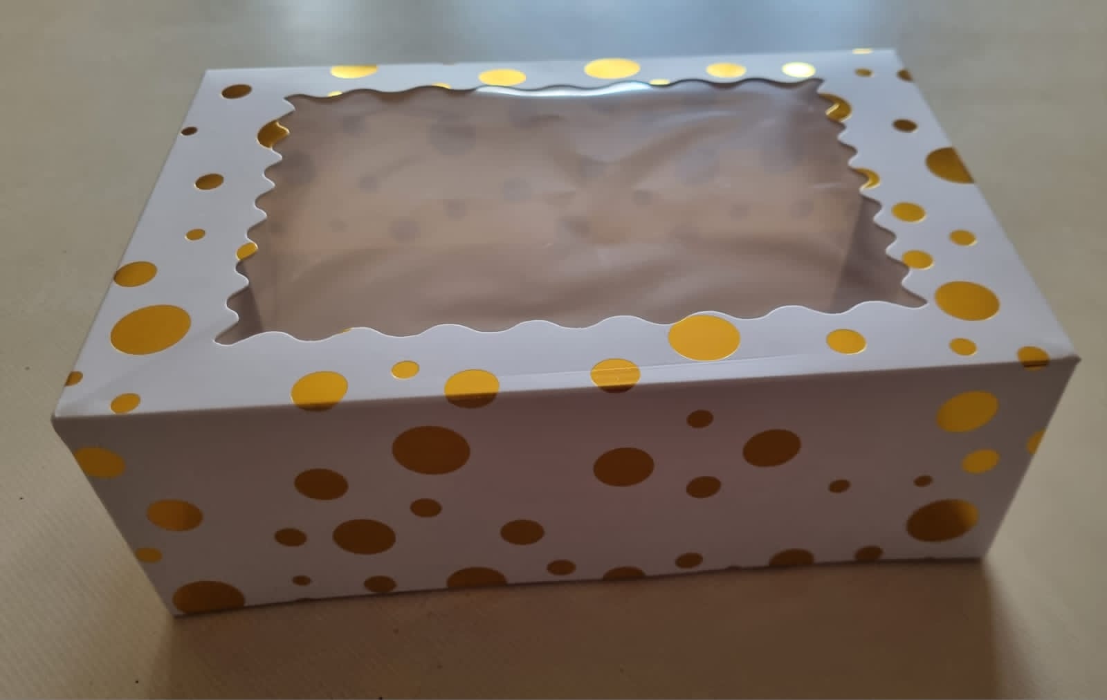 Gift box gold and white single. Rectangular box with cellophane window on top. Measures 23 cm x 15.5 cm and 8 cm high. Perfect for 6 to 8 cupcakes or as a snack box. Will also look great filled with biscuits, biltong or a sweets hamper. Sold per pox.