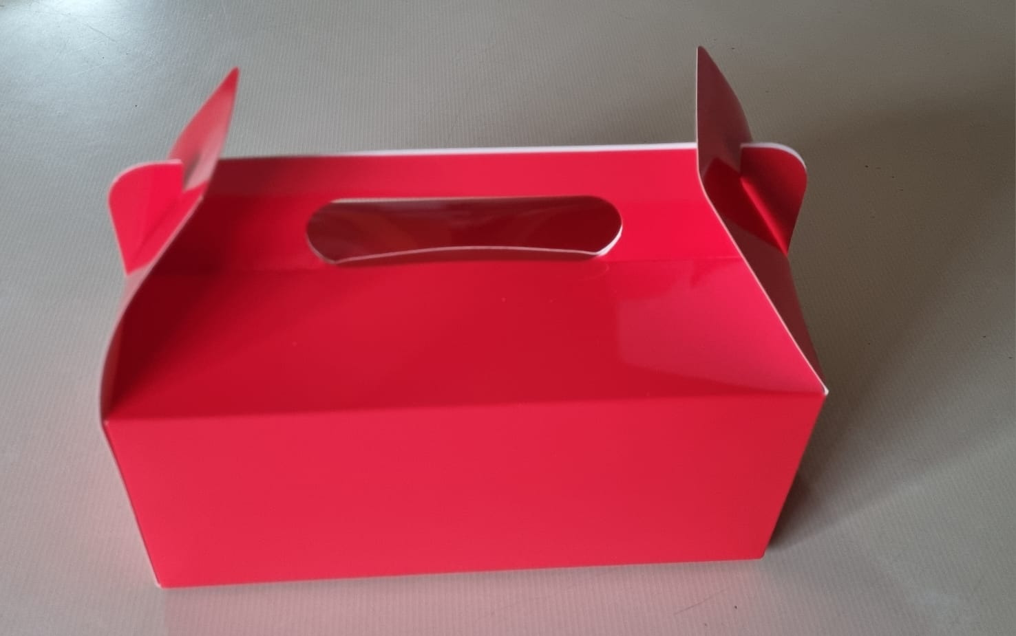 Red handle party boxes. 5 Cardboard boxes per pack. Rectangular party box with handles. Great to fill with sweets or food.19.5x9x8cm.