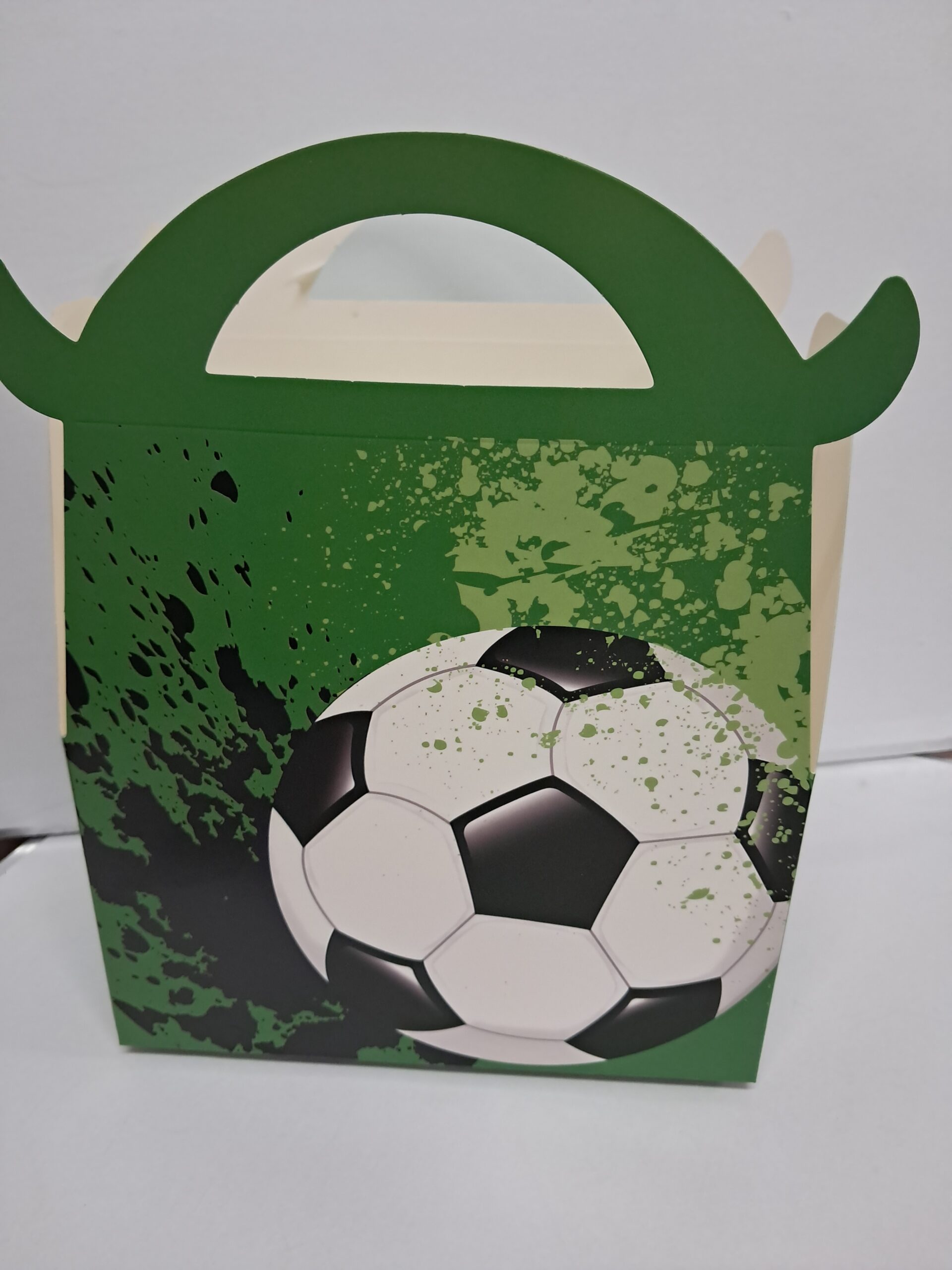 Soccer party boxes 10’s. 10 Handle cardboard boxes per pack. Great for food, snacks or sweets. Perfect with a soccer or sports theme party. Measures 16x9x9cm.