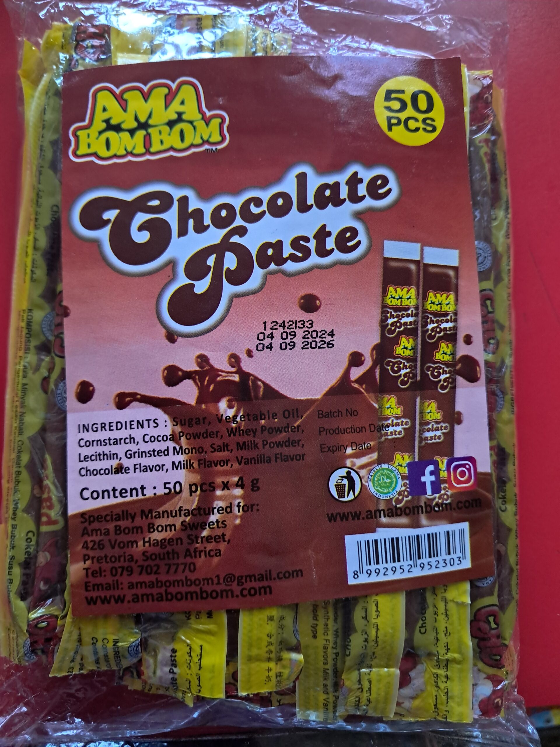 Ama bom bom chocolate sticks 50’s. 50 Chocolate sticks per pack. Add to your party packs or candy buffet. Kids love these chocki sticks.