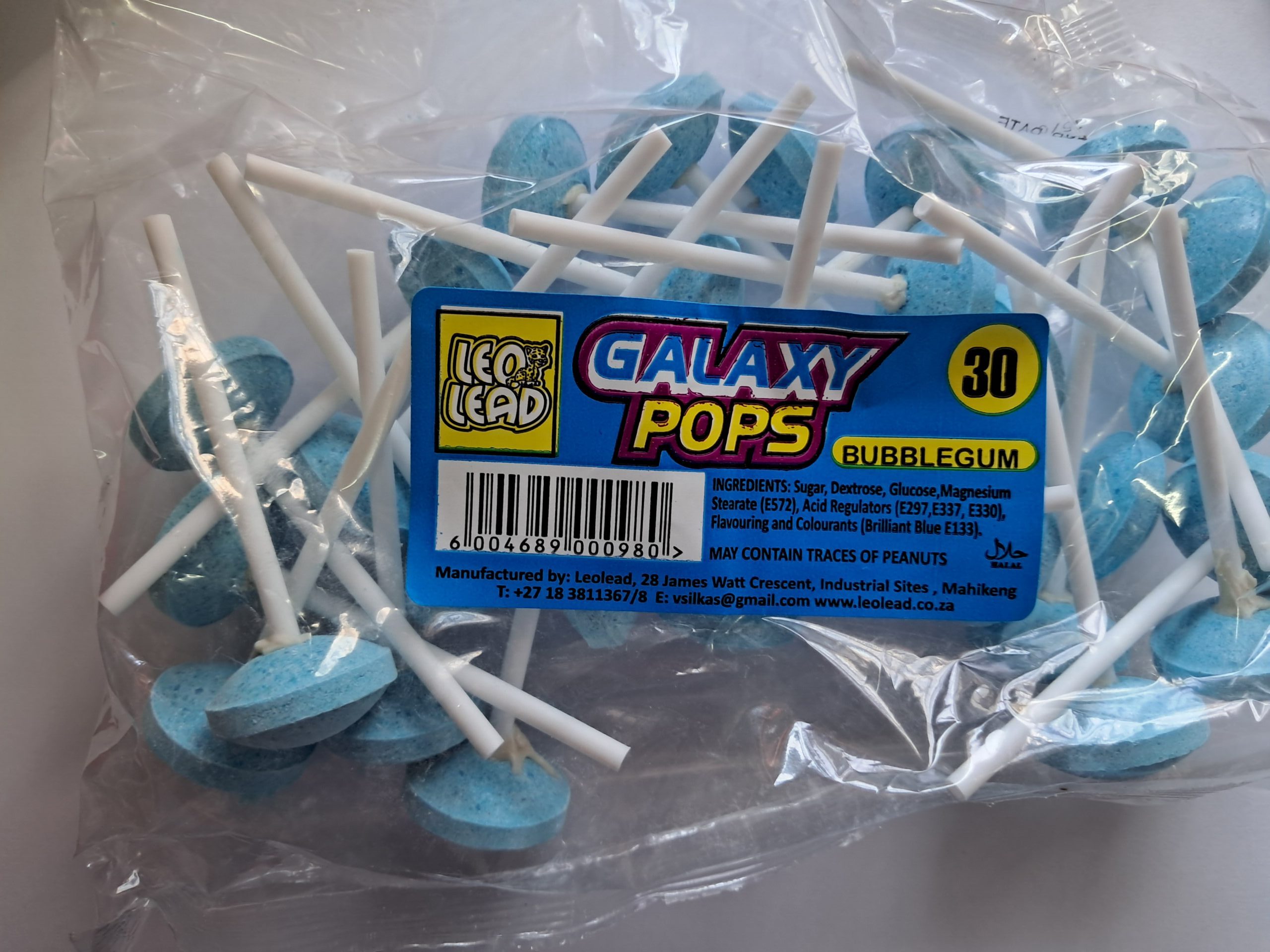 Galaxy pops blue lollipops 30’s. Approximately 30 lollipops per pack. Perfect with a Bluey, Stitch, Sonic, Batman or police theme party.