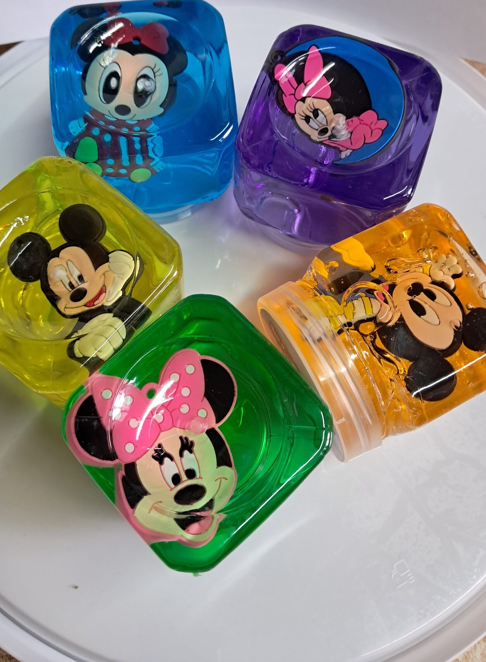 Mickey or Minnie slime singles. Sold individually. Colours of slime and characters will differ depending on stock. Each bottle has either a Mickey or Minnie plastic 2d shape inside. Great fun. Add to party packs as a thank you gift.