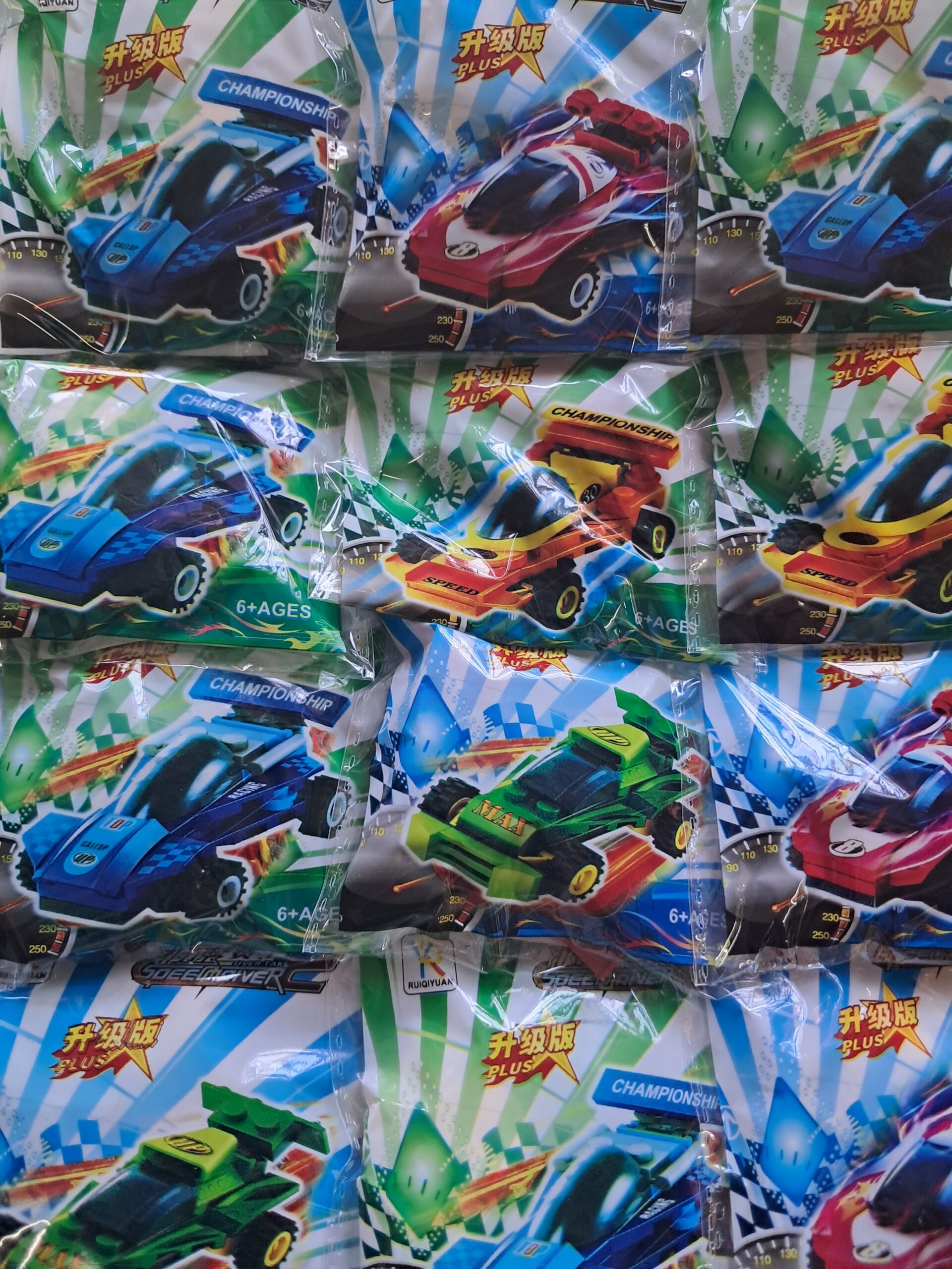 Mini building block novelty toys car shaped 10’s. 10 Individual packets, assorted designs per pack. Great party pack filler toy. Will compliment a racing, hot wheels, car’s or transport theme party. Recommended for 6 years and older. Contains small parts.
