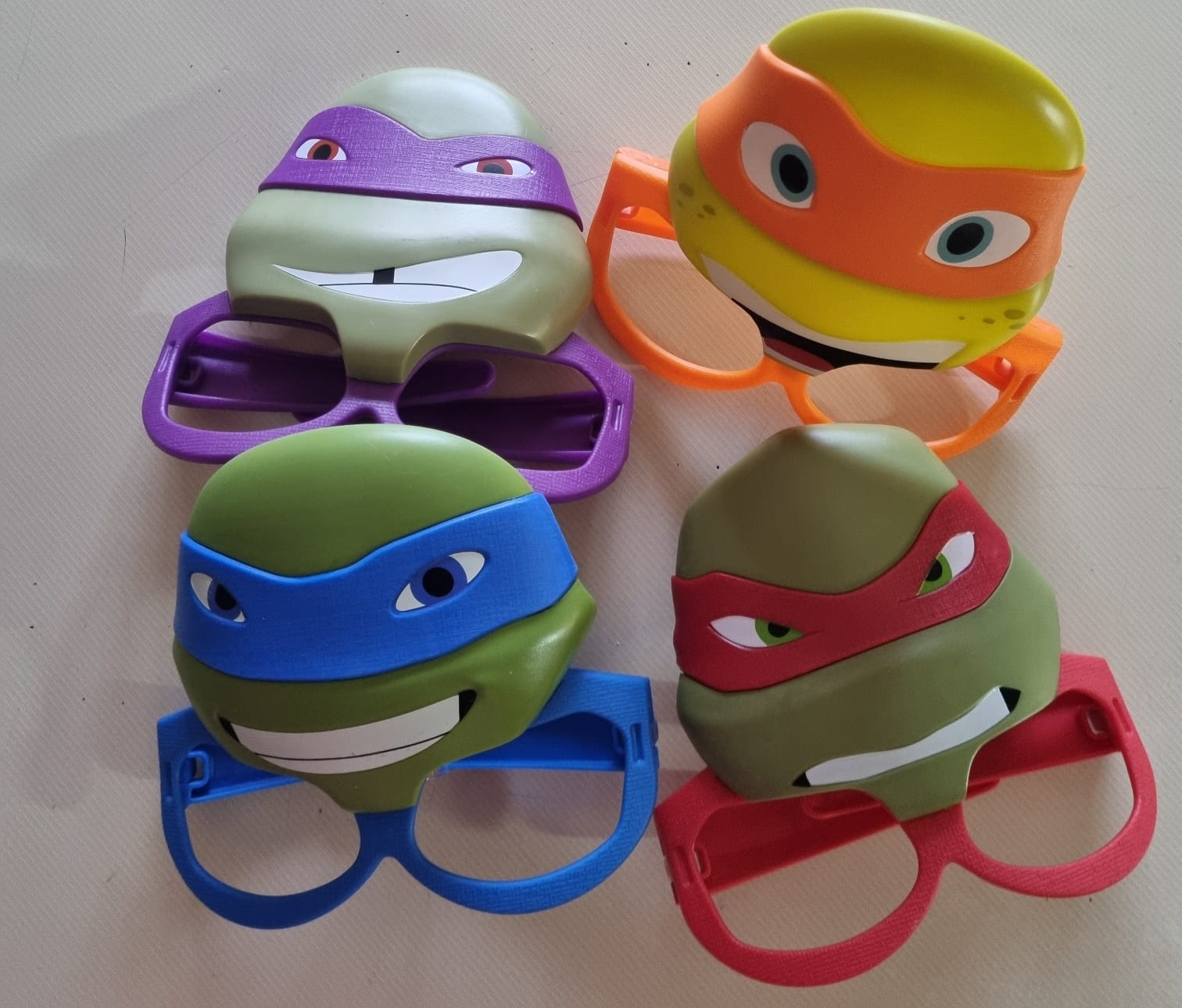 Ninja turtle plastic glasses single. Sold individually. 1 Per pack. Colours are assorted and depends on stock availability. This is a discontinued item and its the last of the last left. Great as party mask. Plastic glasses with ninja turtle face.
